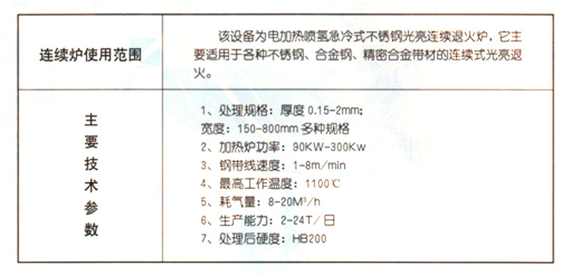 1.属于连续式作业电阻炉,特别适用于薄不锈钢带冷轧压延行业。供不锈钢带连续光亮退火之用。2.配以不锈钢带的收放卷机构, 收卷钢带不出现跑边现象,能承重2t重工件。